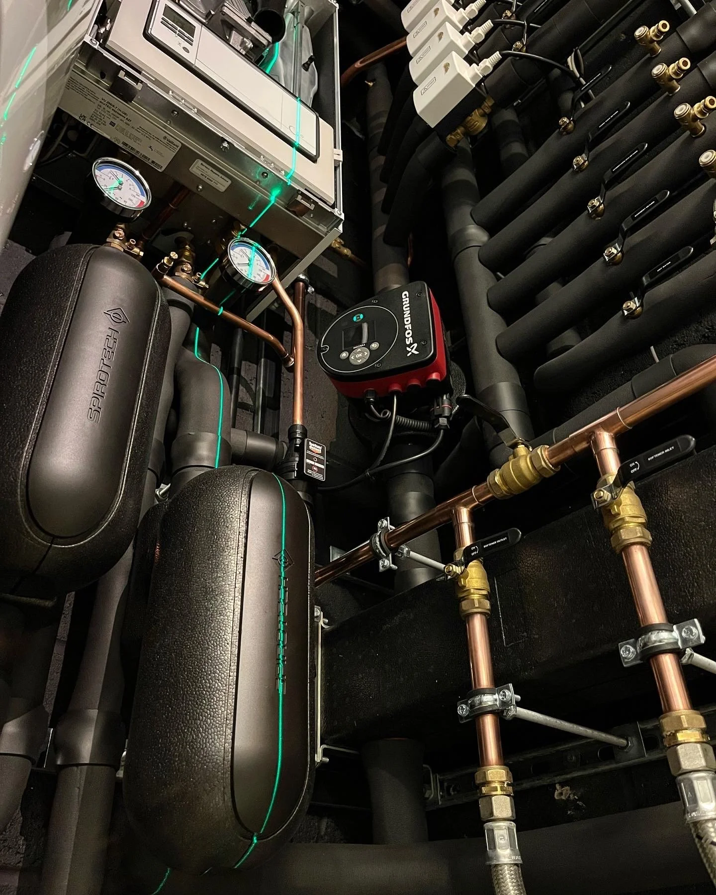 I installed a Vaillant UK exclusive Green iQ 627 system boiler with a 200L heat pump cylinder (UniStor HP) utilising PDHW, Sensocomfort + VR92’s for main zone influence and hot water time scheduling, EPH Controls acutuators, 2 ports and CP4 thermostats for individual room control, all linked onto the Ember app for smart phone integration.